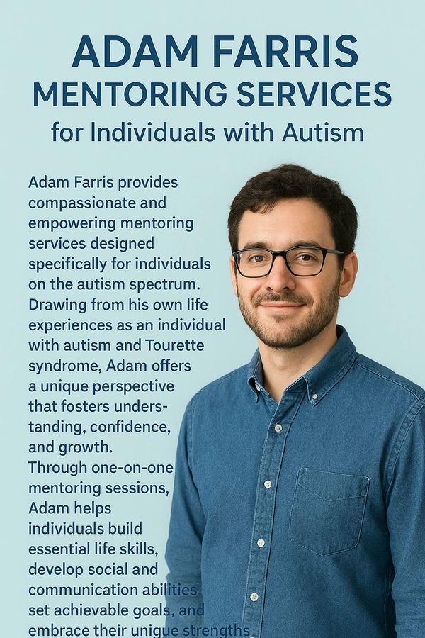 Adam Farris provides compassionate and empowering mentoring services designed specifically for individuals on the autism spectrum. Drawing from his own life experiences as an individual with autism and Tourette syndrome, Adam offers a unique perspective that fosters understanding, confidence, and growth.